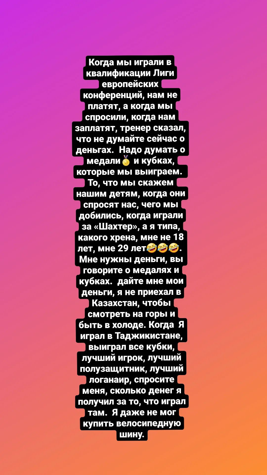 Когда мы играли в квалификации Лиги Конференций нам не платили, а когда мы спросили когда нам заплатят, то тренер сказал не думать о деньгах. Мол, надо думать о медалях и кубках, которые мы выиграем. Что мы скажем нашим детям, когда они спросят нас чего мы добились играя за «Шахтер»? Мне не 18 лет, мне нужны деньги, а вы говорили о медалях и кубках. Я не приехал в Казахстан, чтобы смотреть на горы и быть на холоде. Когда я играл в Таджикистане, то выиграл все возможные трофеи. За те деньги, которые я там получал, даже не мог купить велосипедную шину.