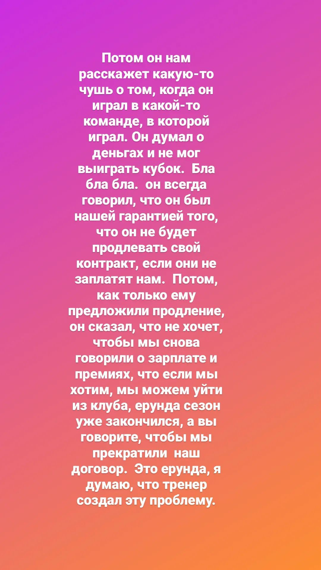 Потом он нам рассказал какую-то чушь о том, что когда он играл в какой-то команде, то он думал о деньгах и поэтому не мог выиграть кубок. Бла-бла-бла. Он всегда говорил, что будет нашей гарантией и откажется продлевать свой контракт, если они не заплатят нам. Но потом, когда ему предложили продление контракта, он сказал нам, что не хочет чтобы мы снова говорили о зарплате и премиях. Что если мы хотим, то можем уйти из клуба. Ерунда! Сезон уже закончился, а вы говорите, что мы прекратили наш договор. Это ерунда. Я думаю, что тренер создал эту проблему», – написал в Instagram Stories бывший игрок карагандинцев.