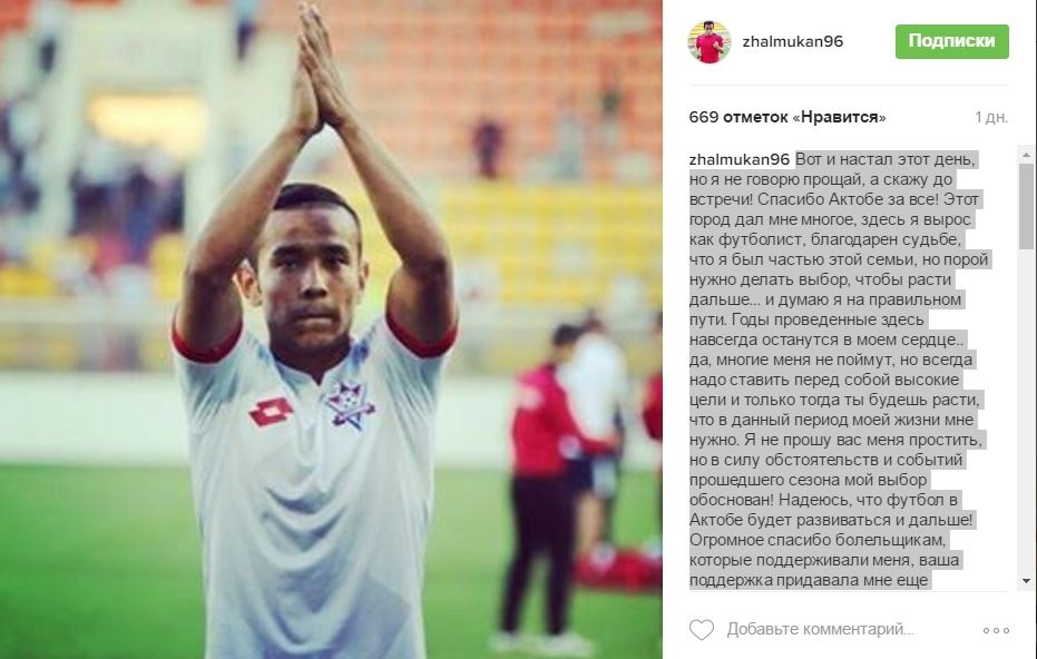 — Вот и настал этот день, но я не говорю прощай, а скажу до встречи! Спасибо «Актобе» за всё! Этот город дал мне многое, здесь я вырос как футболист, благодарен судьбе, что я был частью этой семьи, но порой нужно делать выбор, чтобы расти дальше... И думаю я на правильном пути. Годы, проведенные здесь, навсегда останутся в моем сердце.. Да, многие меня не поймут, но всегда надо ставить перед собой высокие цели и только тогда ты будешь расти, что в данный период моей жизни мне нужно. Я не прошу вас меня простить, но в силу обстоятельств и событий прошедшего сезона мой выбор обоснован! Надеюсь, что футбол в Актобе будет развиваться и дальше! Огромное спасибо болельщикам, которые поддерживали меня, ваша поддержка придавала мне еще больше сил! Отдельное спасибо «13 сектору»: при непогоде, при неудачных играх, всегда верили и поддерживали нас! Вы — лучшие болельщики Казахстана! В своем новом клубе, я всегда буду помнить место, где футбол являлся объектом страсти и превращал людей в одну семью. Всегда буду испытывать к вам теплые чувства и приятные воспоминания. Желаю «Актобе» и болельщикам только успехов и процветания!, — написал Жалмукан.