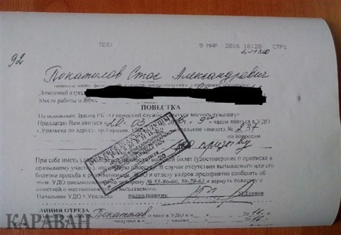 В документе сказано, что 20 марта 2016 года Стасу Покатилову нужно явиться в Управление по делам обороны города Уральска.