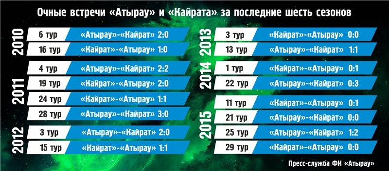В этом сезоне команды между собой сыграли два матча. Первая игра, состоявшаяся в 6-ом туре, завершилась уверенной победой «Атырау» дома – 2:0. Мячи в той игре забили Джолчиев и Сахалбаев. Отчетная встреча пришлась на 16-й тур: «Кайрат» смог одержать домашнюю победу, забив один гол. Мяч в свой актив в ответном матче записал сербский игрок «Кайрата» Джурджевич.