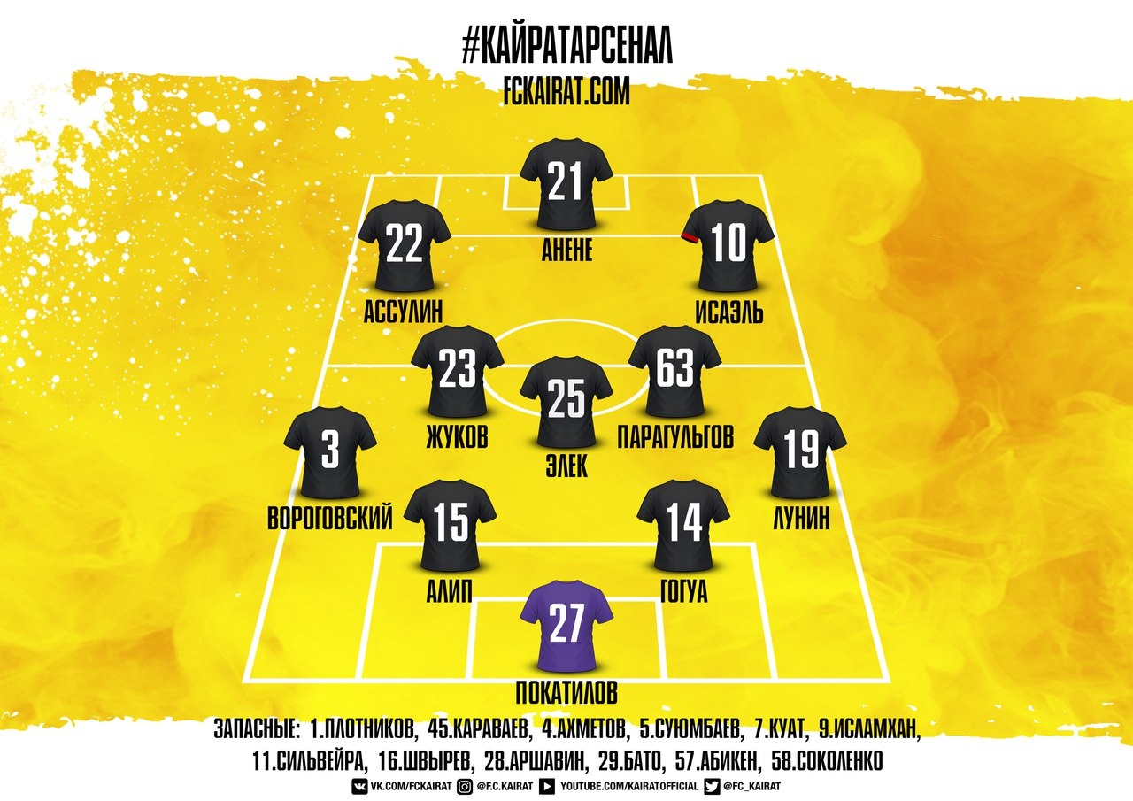 "Кайрат": Стас Покатилов (В) - Ян Вороговский, Седрик Гогуа, Ян Вороговский, Нуралы Алип, Станислав Лунин - Магомед Парагульгов, Акош Элек, Георгий Жуков - Исаэль Барбоза, Гай Ассулин - Чума Анене