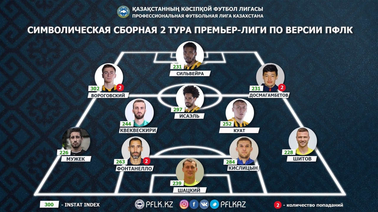 Полузащитник «Ордабасы» Досмагамбетов, как и его партнер по команде Фонтанелло, во второй раз вошел в сборную тура. В противостоянии с «Кызыл-Жар СК» хавбек сделал 5 точных передач в штрафную, выиграл 6 единоборств (эффективность – 67%), отдал 2 ключевые передачи и в 65% взаимодействий с партнерами сделал точный пас. Индекс действий – 226.