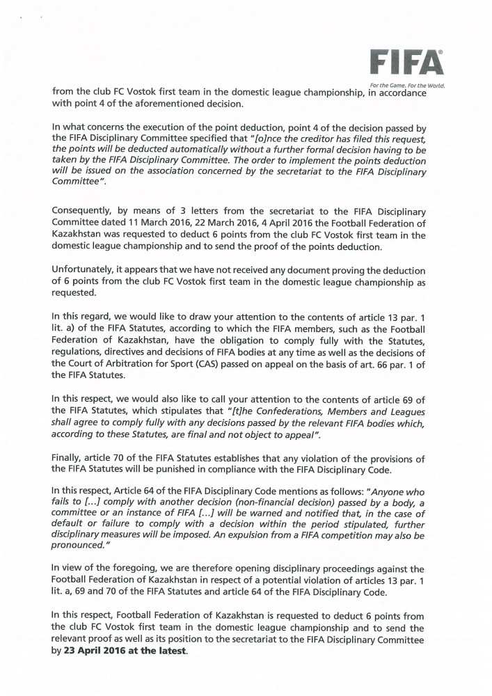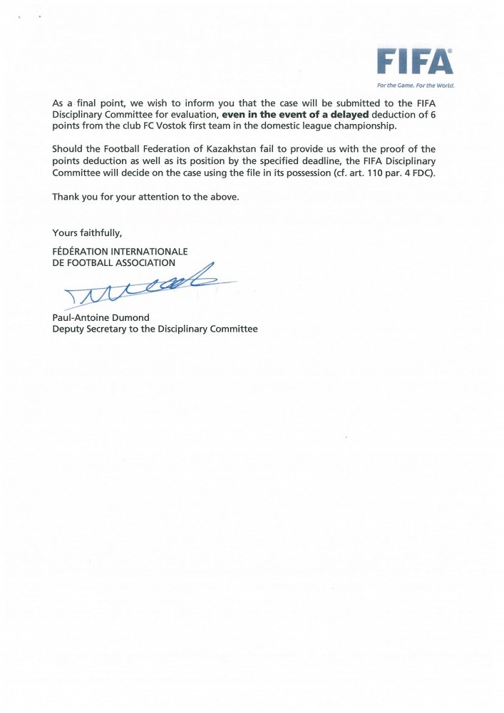 В пункте 4 этих документов было чётко выражено требование ФИФА о снятии с ФК «Восток» очков на основании обращения представителей вышеназванных футболистов.