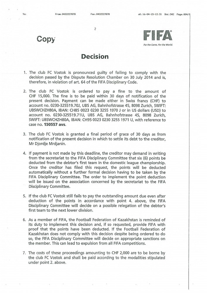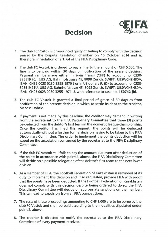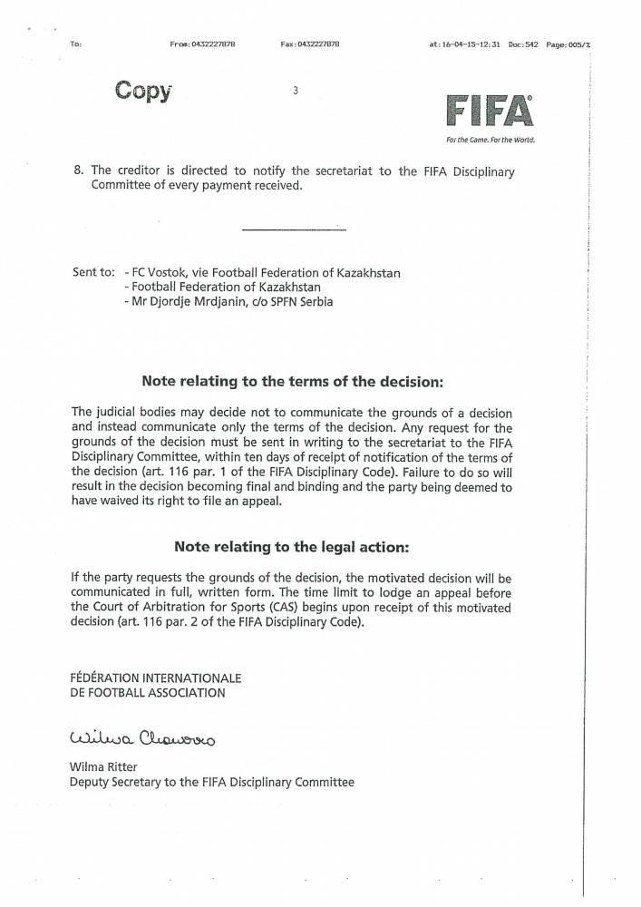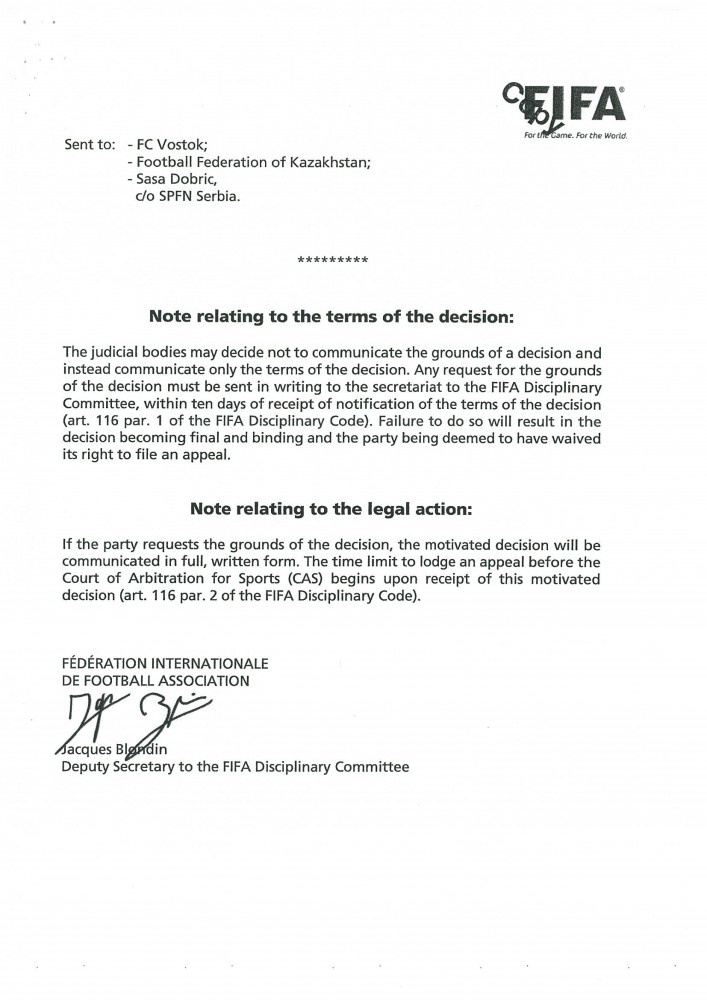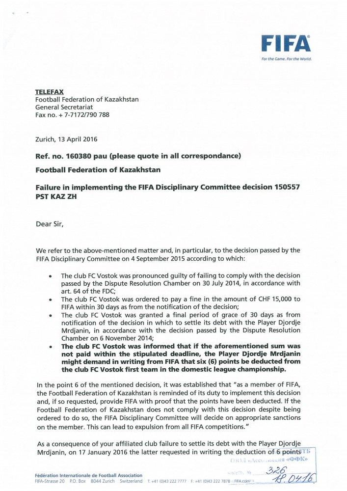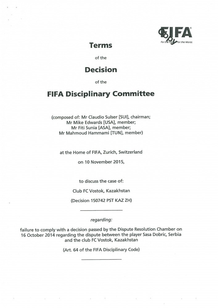В сентябре 2015 года в адрес Федерации футбола Казахстана во исполнение решений юридических органов ФИФА поступили решения Дисциплинарного комитета ФИФА от 04 сентября 2015 года (по делу Джордже Мрджанина) и 10 ноября 2015 года (по делу Саши Добрича) – копии данных решений прилагаются.