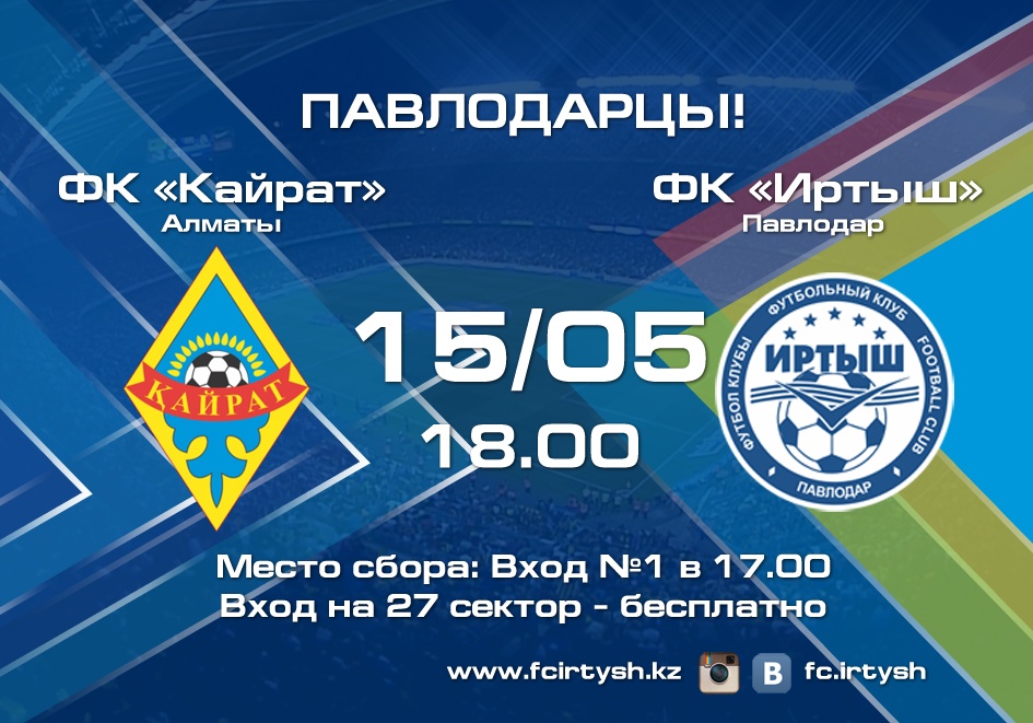15 мая, в 18:00 на "Центральном" стадионе состоится матч "Кайрат" - "Иртыш". Футбольный клуб "Иртыш" просит и призывает вас прийти и яростно поддержать свою команду на 27 (гостевом) секторе!