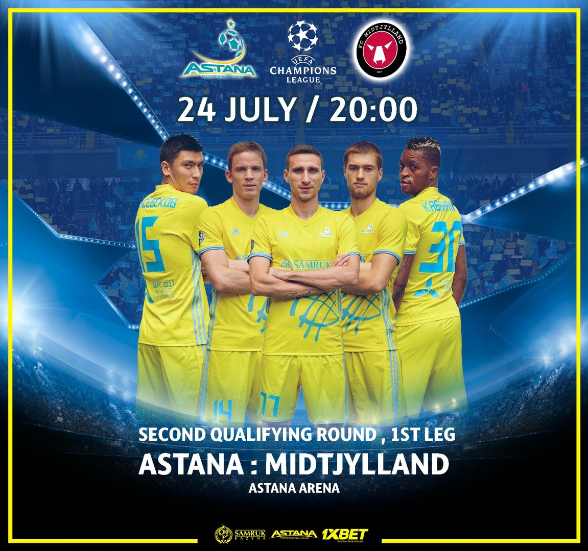 Напомним, первый матч второго квалификационного раунда Лиги Чемпионов УЕФА «Астана» - «Мидтьюлланд» состоится 24 июля в 20:00.