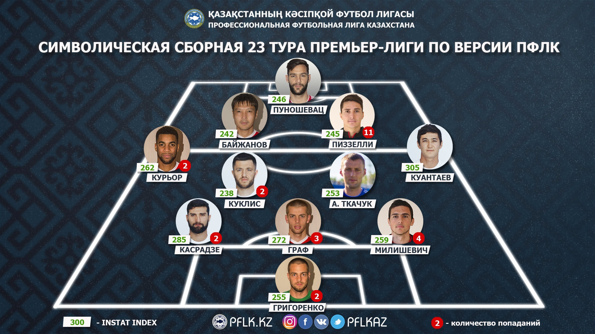 Сборная составлена на основе статистического анализа матчей от партнера ПФЛК – компании InStat. При ее формировании учитывается не только общий индекс действий, но и различные ключевые показатели, характерные для позиции игрока.