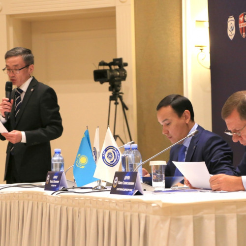 Делегаты заслушали выступления Директора Департамента сертификации и аттестации Казахстанской федерации футбола Ержана Мусабекова и Директора технического центра КФФ Арсена Инкарбекова.