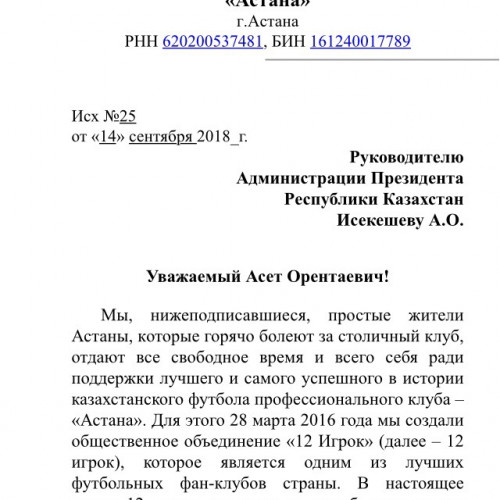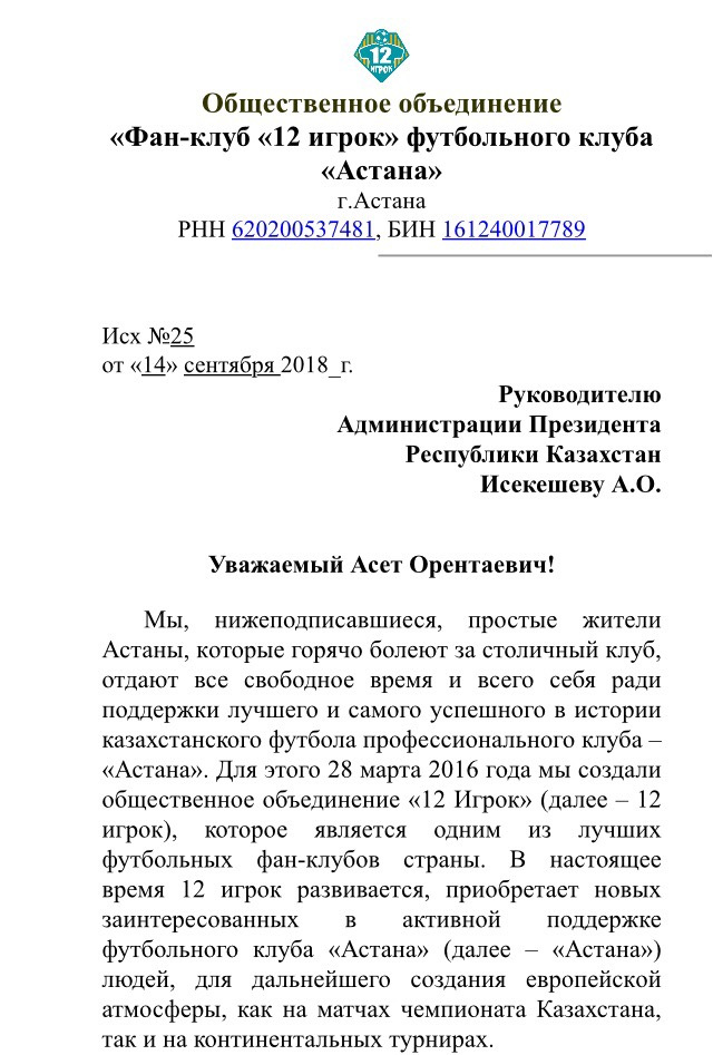Мы, нижеподписавшиеся, простые жители Астаны, которые горячо болеют за столичный клуб, отдают все свободное время и всего себя ради поддержки лучшего и самого успешного в истории казахстанского футбола профессионального клуба — «Астана». Для этого 28 марта 2016 года мы создали общественное объединение «12 Игрок» (далее — 12 игрок) который является одним из лучших футбольных фан-клубов страны. В настоящее время 12 игрок развивается, приобретает новых заинтересованных в активной поддержке футбольного клуба «Астана» (далее — «Астана») людей, для дальнейшего создания европейской атмосферы как на матчах чемпионата Казахстана, так и континентальных турниров.