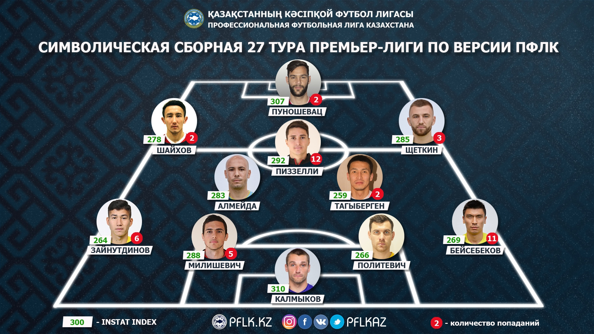 Сборная составлена на основе статистического анализа матчей от партнера ПФЛК – компании InStat. При ее формировании учитывается не только общий индекс действий, но и различные ключевые показатели, характерные для позиции игрока.