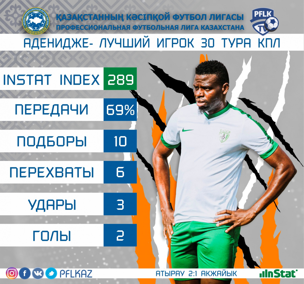 Успех «Атырау» в «западном дерби» во многом стал возможен индивидуальному мастерству и виртуозности Аденидже. В непросто складывающимся противостоянии он сделал результат двумя мастерскими ударами. Два заработанных на себе фола, 69% точных передач, 4 обостряющих паса в чужую штрафную и столько же успешных верховых единоборств, 10 подборов и 6 перехватов – в воскресенье нигериец выжал из себя все до последней капли. Индекс действий лучшего игрока минувшего тура равен 289 баллам.