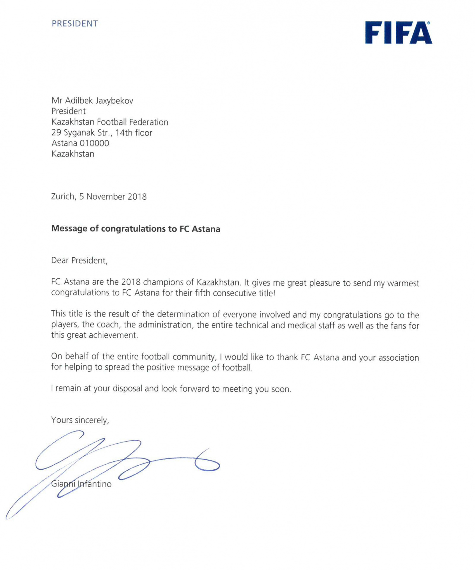 - ФК «Астана» - чемпионы Казахстана в 2018 году. Для меня огромное удовольствие отправить мои самые теплые поздравления ФК «Астана с их пятым подряд титулом! От имени всего футбольного сообщества я хотел бы поблагодарить ФК «Астана» и вашу Федерацию за помощь в распространении позитивного послания футбола, - написал Инфантино в своем поздравительном письме.
