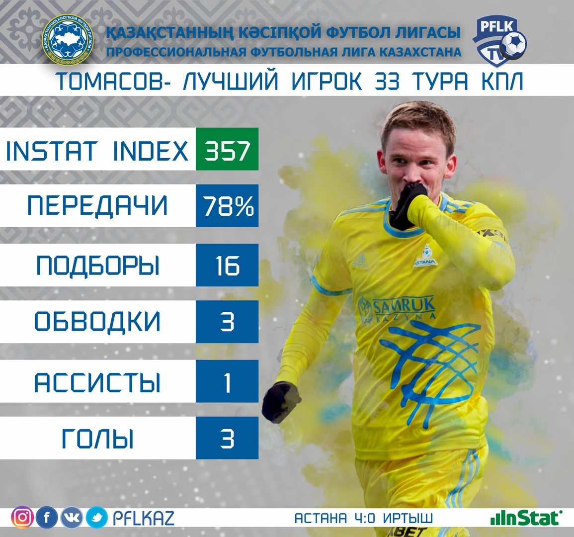 В противостоянии с «Иртышом» Томасов перманентно терроризировал защитные порядки гостей, играл ярко и непринужденно, создавал и реализовывал. Хорватский вингер столичного клуба поучаствовал в каждом из четырех забитых мячей – хет-трик и голевая. В остальном – он довел до цели 78% пасов, 6 раз обострил ситуацию в штрафной соперника, оформил три ключевые передачи, завершил три обводки и собрал 16 подборов. Индекс действий лучшего игрока всего тура составил 357 баллов.
