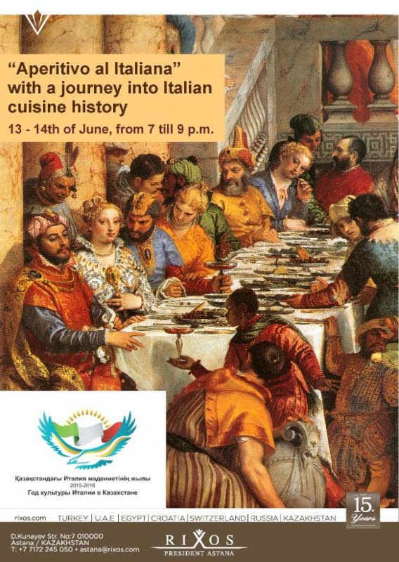We are happy to invite you to a 2 day seminar about Italian culinary culture in the frame of "Year of Italian culture in Kazakhstan", conducted with the help of Italian Embassy in Astana. The speaker of the event is the Head of Research Library at The Pushkin State Museum of Fine Arts, Mrs. Ekaterina Igoshina. The themes of the lectures are: 1)Journey to the world of Ancient Rome cuisine and 2) Italian banquet of Renaissance time. The dates are: 13-14th of June, from 7 till 9 p.m. We offer aperitivo with Negroni, Spritz with light snacks (selection of cheeses, salumi, pizzette and rustico), interesting lecture and live music. Ticket for 1 day is 5000 kzt, for both days - 8000 KZT per person. Tickets are sold at the reception. Tel: 8 7172 245050, 8 701 929 9930.