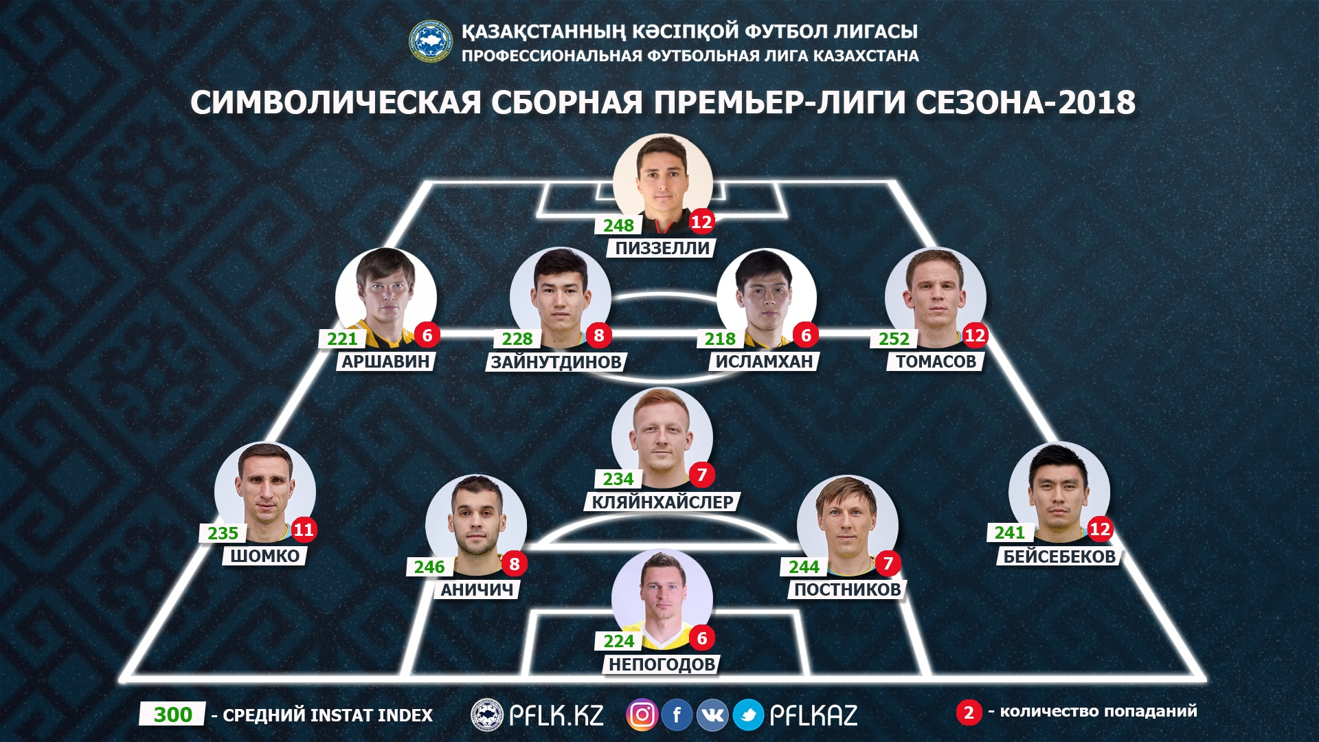 После каждого тура минувшего сезона ПФЛК на основе статистического анализа матчей от компании-партнера InStat составляла список одиннадцати лучших футболистов. При его формировании учитывались общий индекс действий и различные ключевые показатели игрока, характерные для его позиции.