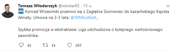 "Конрад Вжесиньски перешёл из "Заглембе" в "Кайрат". Контракт подписан на 2-3 года",- говорится в сообщении журналиста.