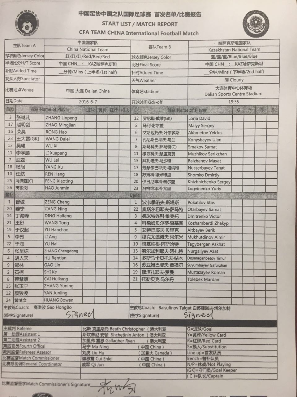 Стартовый состав сборной Казахстана на матч с Китаем