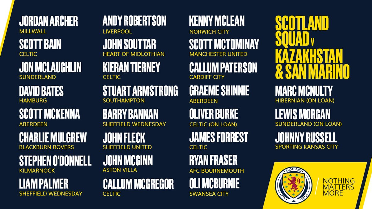 Защитники: Дэвид Бейтс (Гамбург), Скотт МакКенна (Абердин), Чарли Малгрю (Блэкберн Роверс), Стивен О'Доннелл (Килмарнок), Лиам Палмер (Шеффилд Уэнсдей), Энди Робертсон (Ливерпуль), Джон Сауттар (Харт оф Мидлотиан), Керан Тирни (Селтик);