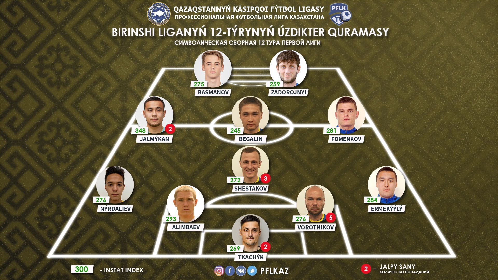 Жалмукан славно порезвился в малом дерби двух столиц. Казалось, что он играл себе в удовольствие и все у него получалось удивительно легко. Как результат, он стал самым ценным игроком тура с 9 ударами и двумя забитыми мячами, 73% точности пасов, 4 острыми передачами в штрафную алматинцев и парой обводок. Индекс действий – 348.