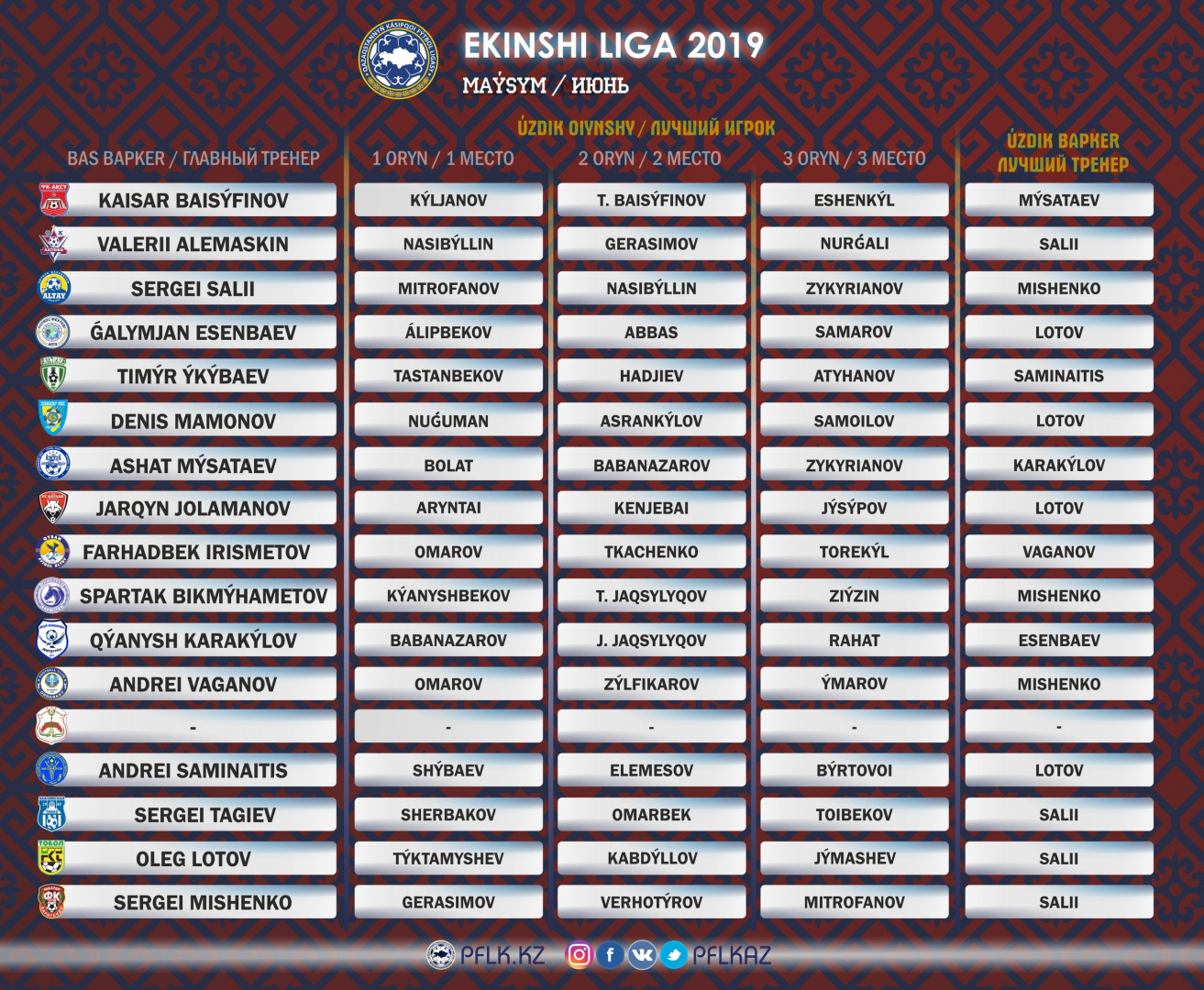 Лучшим футболистом Второй лиги в июне стал полузащитник "Кыран М" Динмухаммед Омаров, у которого 6 набранных баллов.