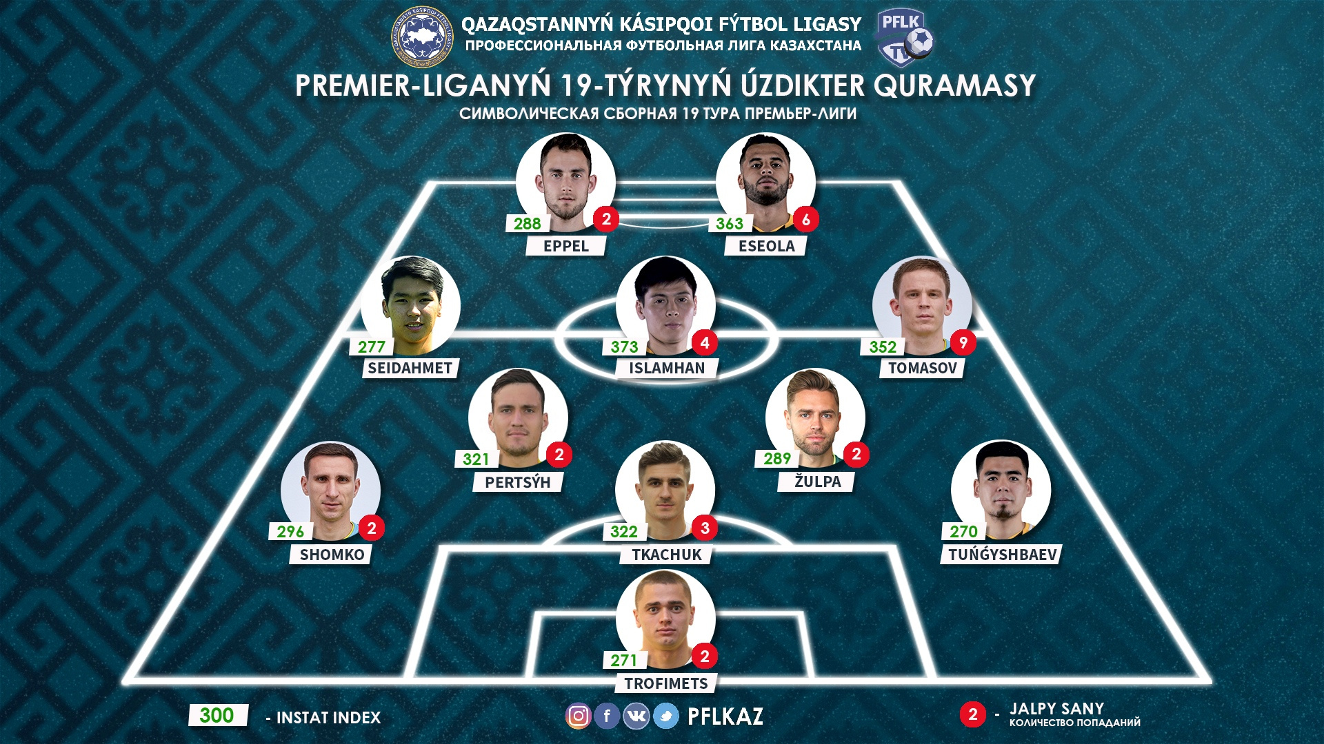 Исламхан был привычно эффективен, развивал атаки не только через центр, но и частенько делал это по флангам. Капитан «Кайрата» частенько тревожил голкипера «Тобола» своими ударами и в концовке отметился реализованным пенальти. Плюс к этому он отдал два ассиста, выполнил 8 обостряющих передач, выиграл 68% борьбы, 7 раз обыграл соперника один в один, а общая эффективность его пасов достигла отметки 79%. Индекс действий – 373 баллов, что является лучшим показателем в туре.