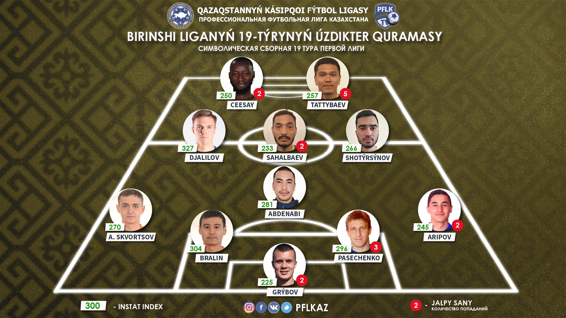 Атакующие полузащитники: Рауль Джалилов, «Жетысу Б»; Руслан Сахалбаев, «Каспий»; Фаррух Шотурсунов, «Мактаарал»