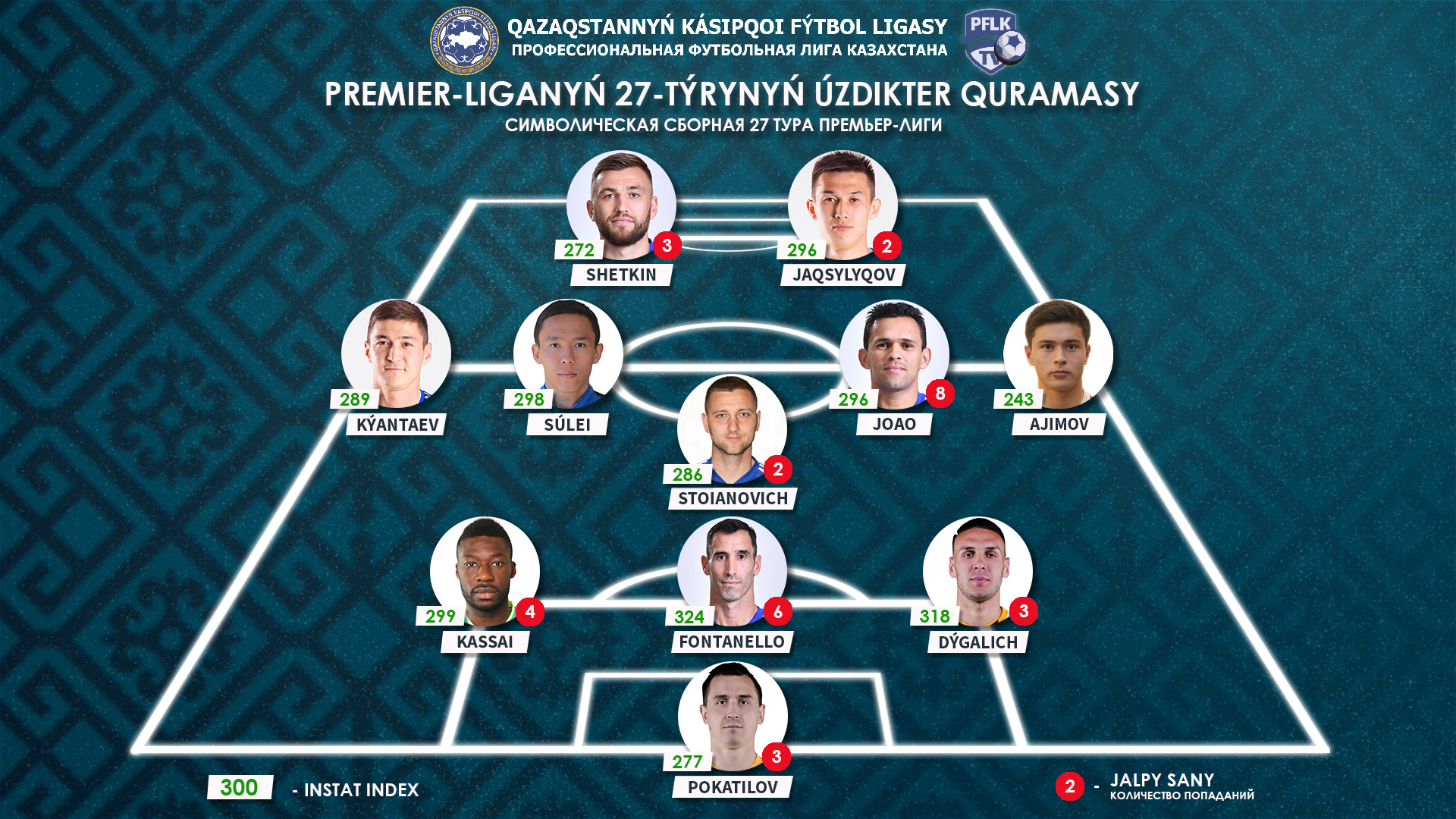 В поединке с «Кайсаром» оборона «Кайрата» во главе с вратарем Покатиловым стояла неприступной скалой. Всего в этом матче голкипер алматинцев отбил 6 ударов, включая сейв после того, как нападающий кызылординцев выбежал с ним на рандеву, а также все три раза удачно сыграл на выходе. Индекс действий – 277.