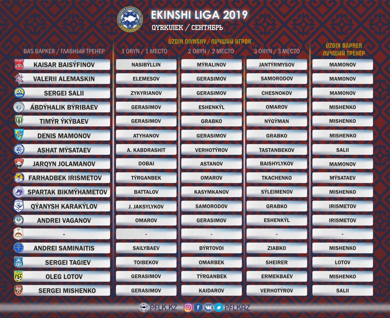 В номинации «Лучший игрок сентября» победу с внушительным отрывом одержал нападающий «Шахтер М» Матвей Герасимов. В общей сложности он набрал 20 очков.