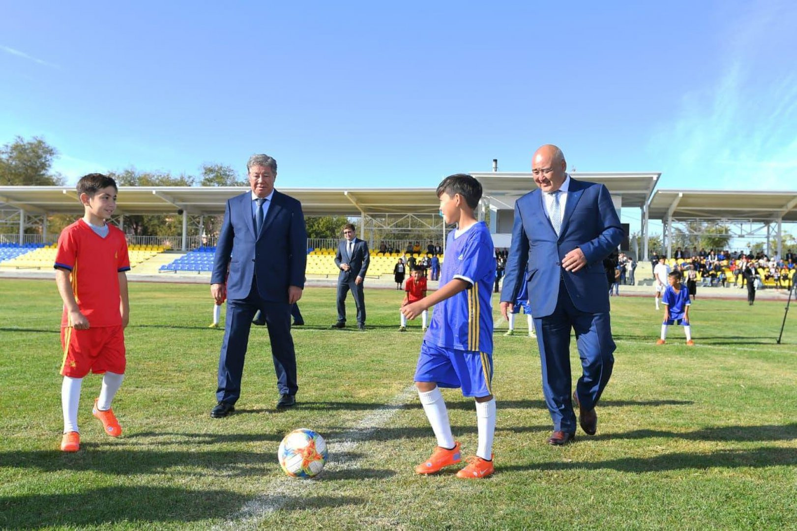 В конце августа было завершено строительство, и арысцы получили стадион с новым футбольным полем, беговой дорожкой и трибунами. Перед началом игры Ахметжан Есимов подарил футбольный мяч, подписанный игроками команды "Астана", и пожелал таких же успехов и спортивных достижений, как у одной из ведущих футбольных команд страны.