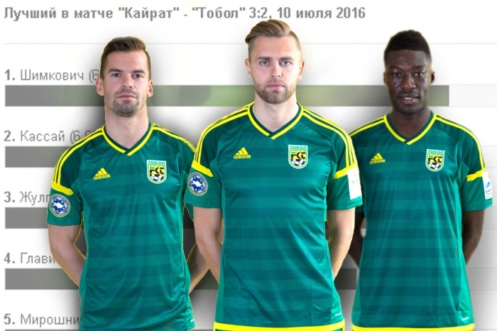 В матче «Кайрат» - «Тобол» эксперты почти сразу выделили тройку лучших футболистов костанайской команды. С небольшими вариациями группа выставленная на утверждение болельщикам выглядела так: Шимкович, Жулпа, Кассай, Главина и Мирошниченко.