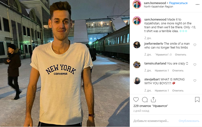 В комментариях подписчики Хоумвуда назвали его сумасшедшим, увидев его фото на перроне в минус 13 в одной футболке на севере Казахстана.