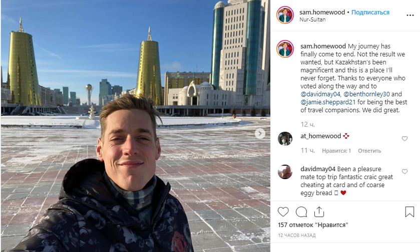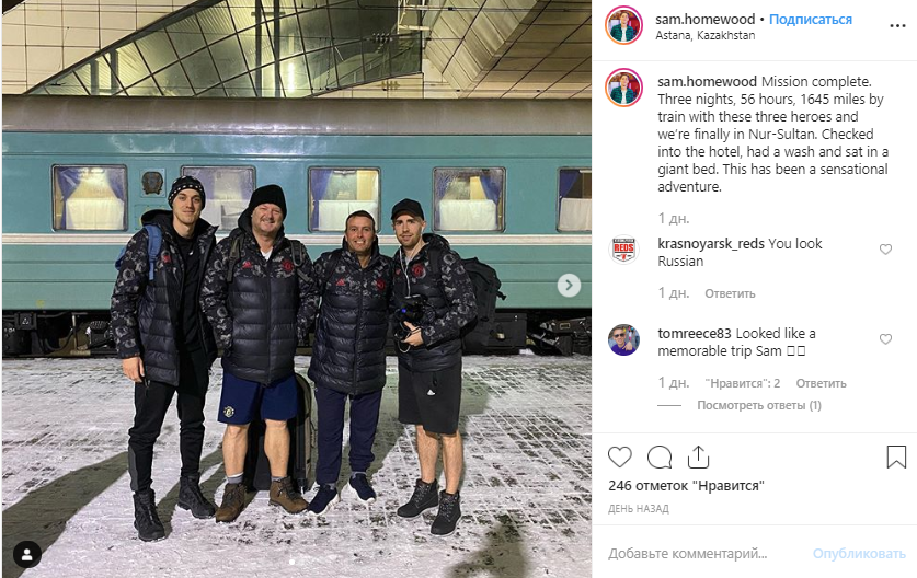 "Миссия выполнена. Три ночи, 56 часов, 1645 миль на поезде с этими тремя героями, и мы наконец в Нур-Султане. Зарегистрировались в отеле, помылись и сели на гигантскую кровать. Это было сенсационное приключение", – пишет он в Instagram.