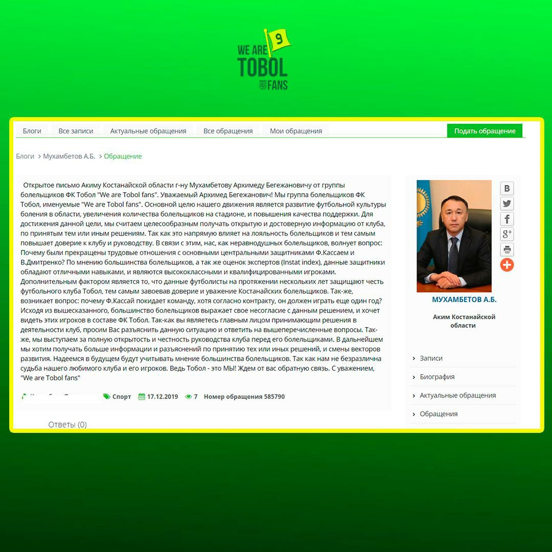 "Уважаемый Архимед Бегежанович! Мы группа болельщиков ФК Тобол, именуемые "We are Tobol fans". Основной целю нашего движения является развитие футбольной культуры боления в области, увеличения количества болельщиков на стадионе, и повышения качества поддержки. Для достижения данной цели, мы считаем целесообразным получать открытую и достоверную информацию от клуба, по принятым тем или иным решениям. Так как это напрямую влияет на лояльность болельщиков и тем самым повышает доверие к клубу и руководству.