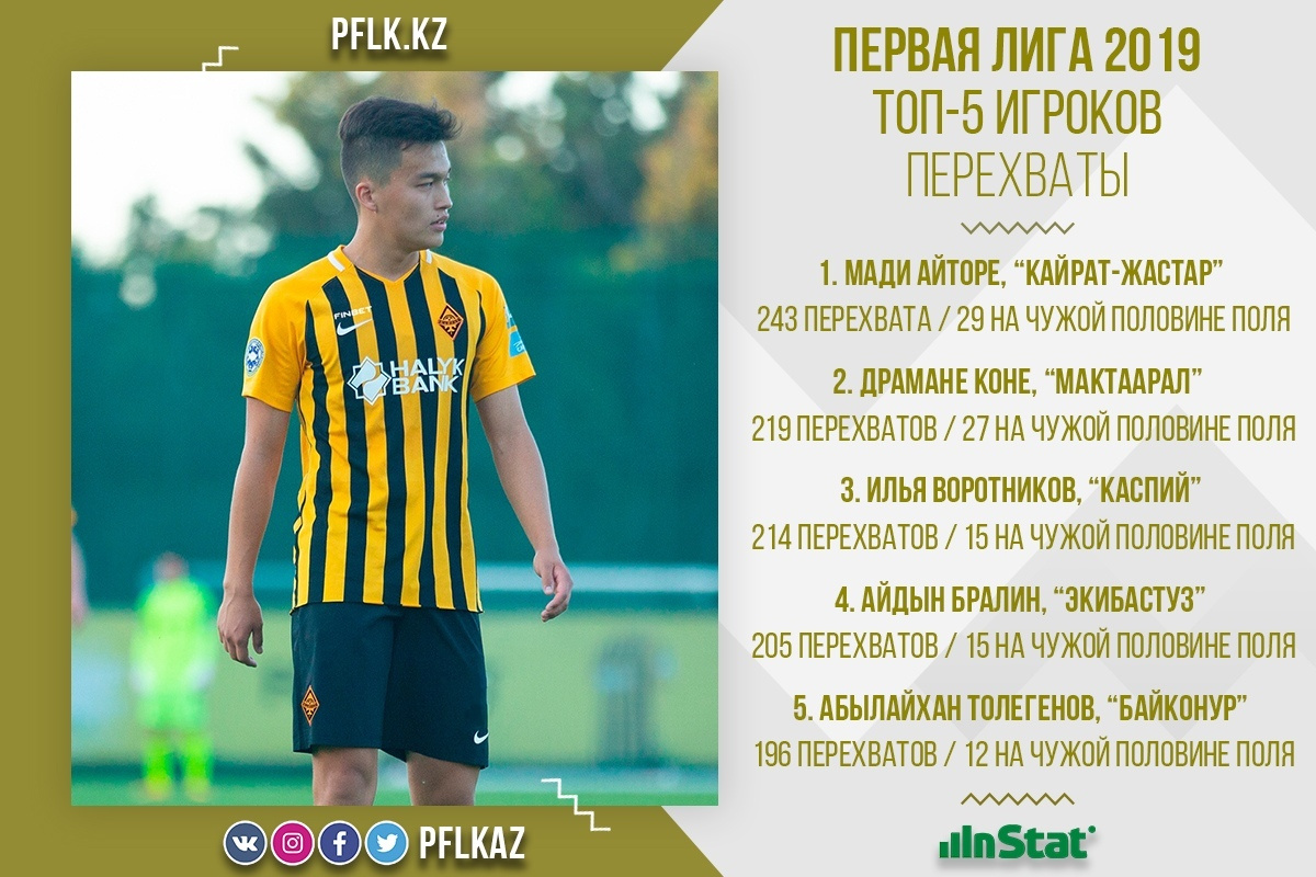 1. Мади Айторе, «Кайрат-Жастар» - 243 перехвата, 29 на чужой половине поля;