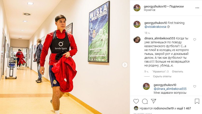 "Когда ты уже заткнешься по поводу казахстанского футбола?! С...а не плюй в колодец из которого пьешь, закрой рот и доказывай делом. А так как футболист ты гав.о!!!! Больше не возвращайся на родину, ублюд...к", - написала в комментариях некая Динара. Речь идет об интервью Жукова польским СМИ.