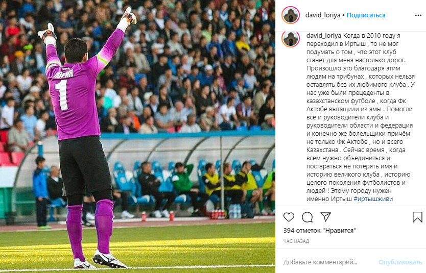 "Когда в 2010 году я переходил в "Иртыш", то не мог подумать о том, что этот клуб станет для меня настолько дорог. Произошло это благодаря этим людям на трибунах, которых нельзя оставлять без их любимого клуба. У нас уже были прецеденты в казахстанском футболе, когда ФК "Актобе" вытащили из ямы. Помогли все: и руководители клуба, и руководители области, и федерация, и, конечно же, болельщики, причём не только ФК "Актобе", но и всего Казахстана. Сейчас время, когда всем нужно объединиться и постараться не потерять имя и историю великого клуба, историю целого поколения футболистов и людей! Этому городу нужен именно "Иртыш", - написал Лория, выступавший за павлодарский клуб в 2010-2012 и 2015-2017 гг.