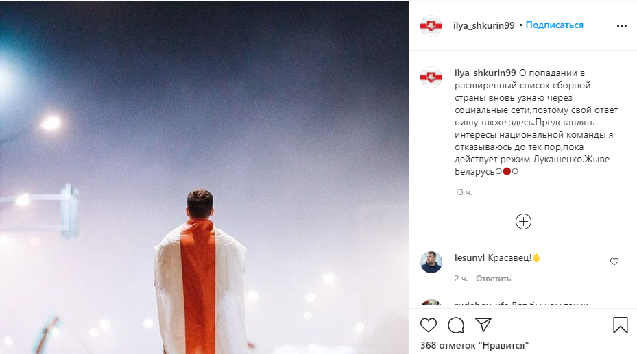 «О попадании в расширенный список сборной страны вновь узнаю через социальные сети, поэтому свой ответ пишу также здесь. Представлять интересы национальной команды я отказываюсь до тех пор, пока действует режим Лукашенко. Жыве Беларусь», – написал Шкурин в своем Instagram.