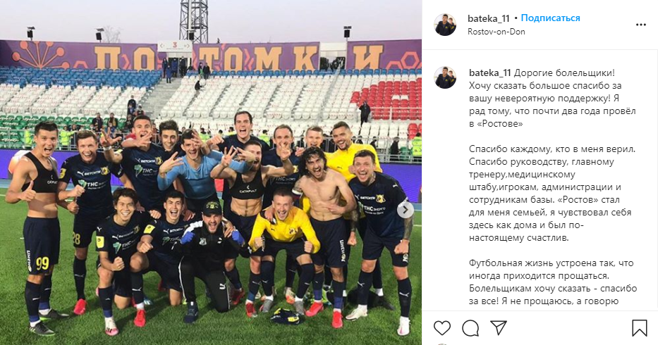 «Дорогие болельщики! Хочу сказать большое спасибо за вашу невероятную поддержку! Я рад тому, что почти два года провёл в «Ростове».