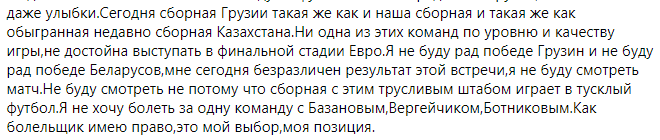 «Сегодня сборная Грузии такая же, как и наша сборная и такая же, как обыгранная недавно сборная Казахстана. Ни одна из этих команд по уровню и качеству игры недостойна выступать в финальной стадии EURO», – написал Исаев.