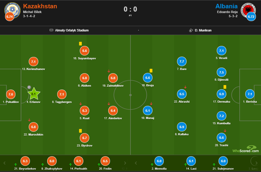 Казахстанская сборная получила оценку 6.74, Албания – 6.72.
