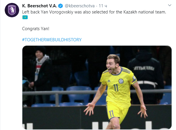 «Левый защитник Ян Вороговский также был вызван в сборную Казахстана. Поздравляем, Ян!» – говорится в Twitter «Беерсхота».