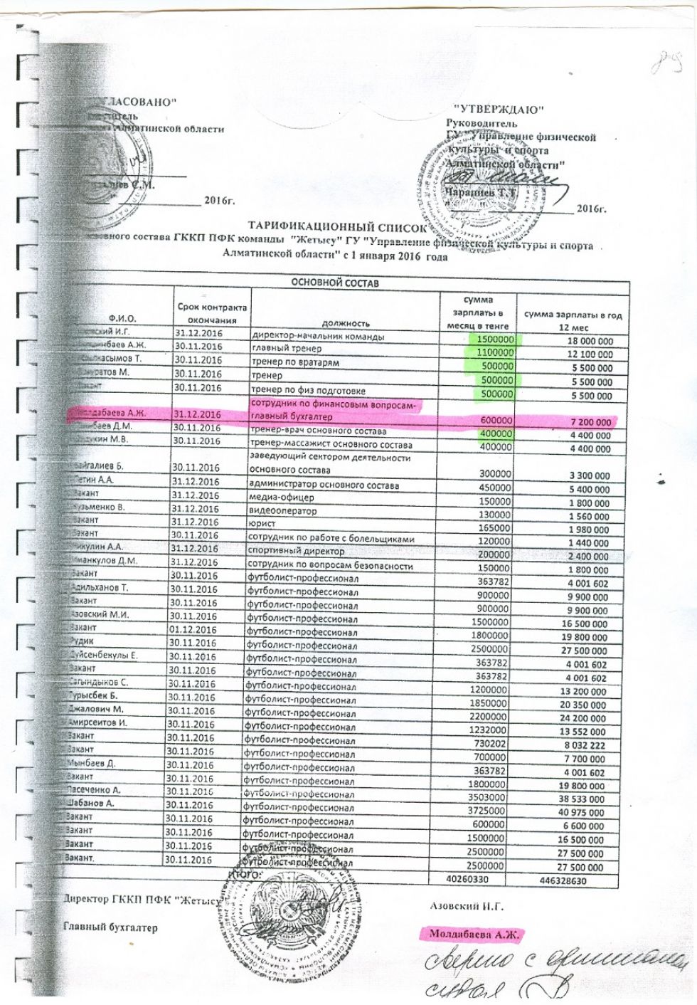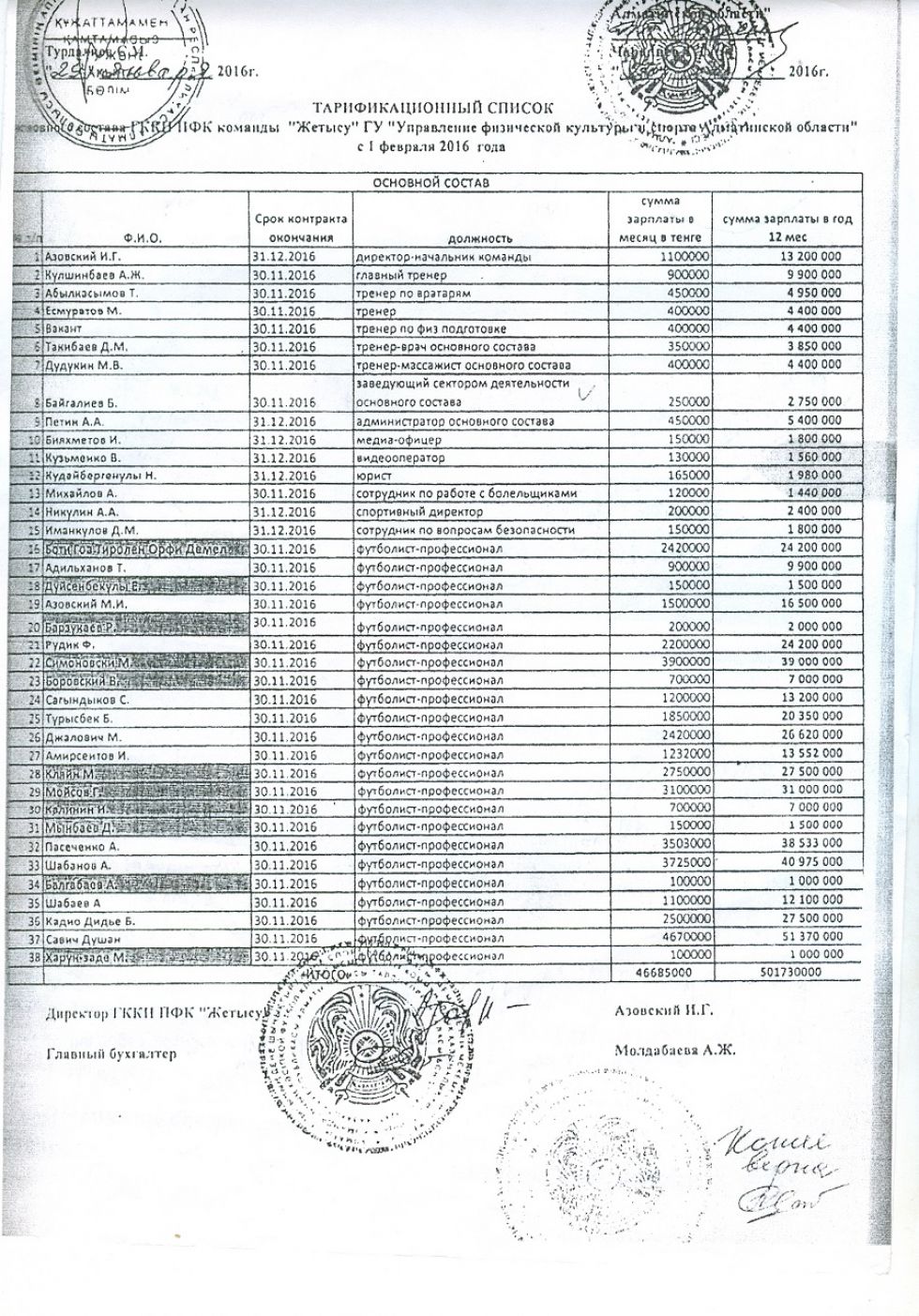 Директор клуба, бухгалтер и юрист являются гражданскими служащими, а не членами команды мастеров. Относятся к административно-хозяйственному персоналу государственного казенного коммунального предприятия. Не имеют права получать огромные деньги. Но они начисляют себе непомерные оклады. Например, директор футбольного клуба платил себе полтора миллиона тенге в месяц. В суде же они предоставляли разные тарификации. Один раз с окладом в 1 500 000 тенге, в другом 1 100 000», – говорит Александр Никулин.