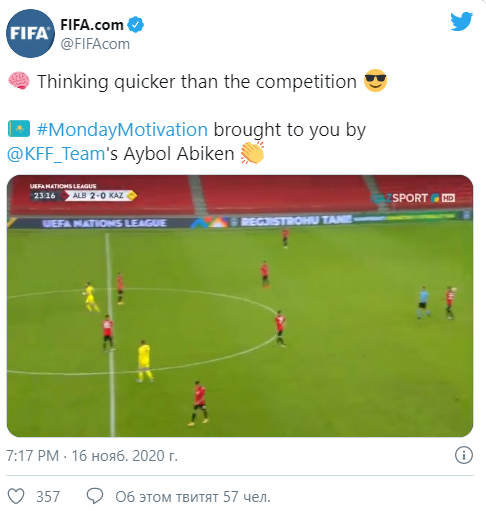 «Соображает быстрее, чем соперник. #МотивационныйПонедельник от игрока сборной Казахстана Айбола Абикена», – пишет пресс-служба ФИФА.