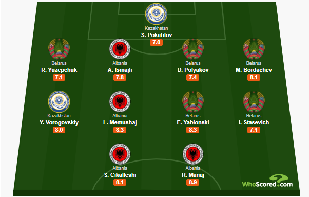 Футболисты сборной Казахстана после матча с Албанией (1:3) попали в число 11 лучших игроков.