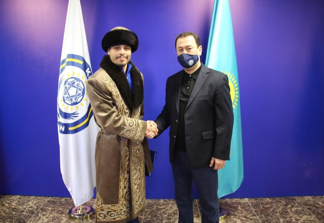 Генеральный секретарь КФФ Азамат Айтхожин в офисе Дома футбола наградил Игиту благодарственным письмом от имени Президента федерации Адильбека Джаксыбекова, а также подарил традиционный казахский чапан.