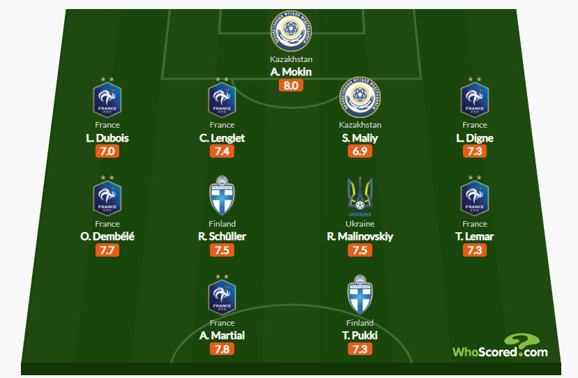 39-летний Александр Мокин стал лучшим игроком всего тура с оценкой 8,0. Голкипер Национальной сборной в матче с Францией совершил 7 сейвов и отразил пенальти от Килиана Мбаппе. Защитник сборной Казахстана Сергей Малый с оценкой 6,9, также оказался в символической сборной тура группы G по версии портала.