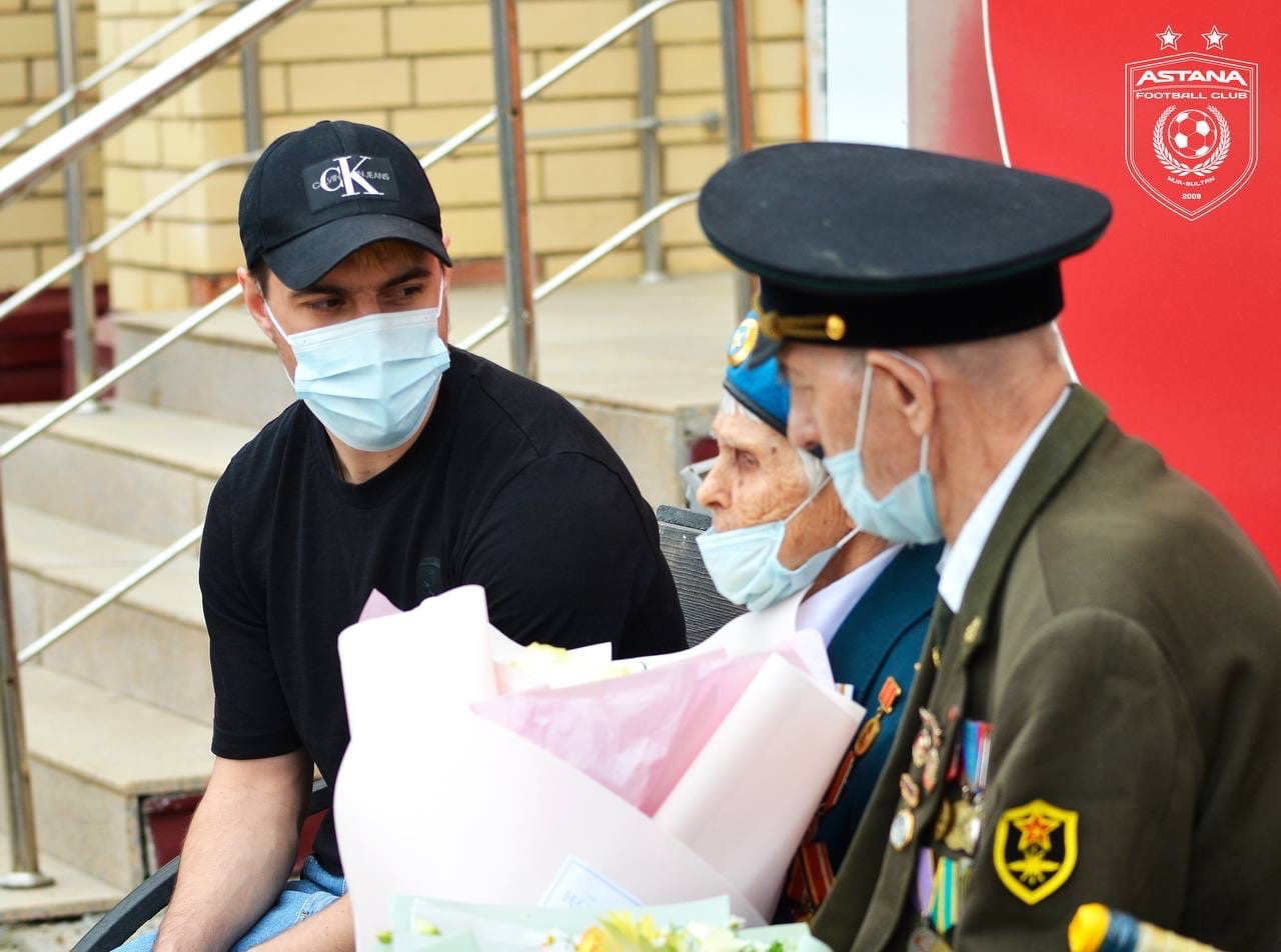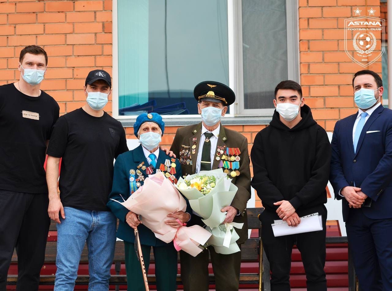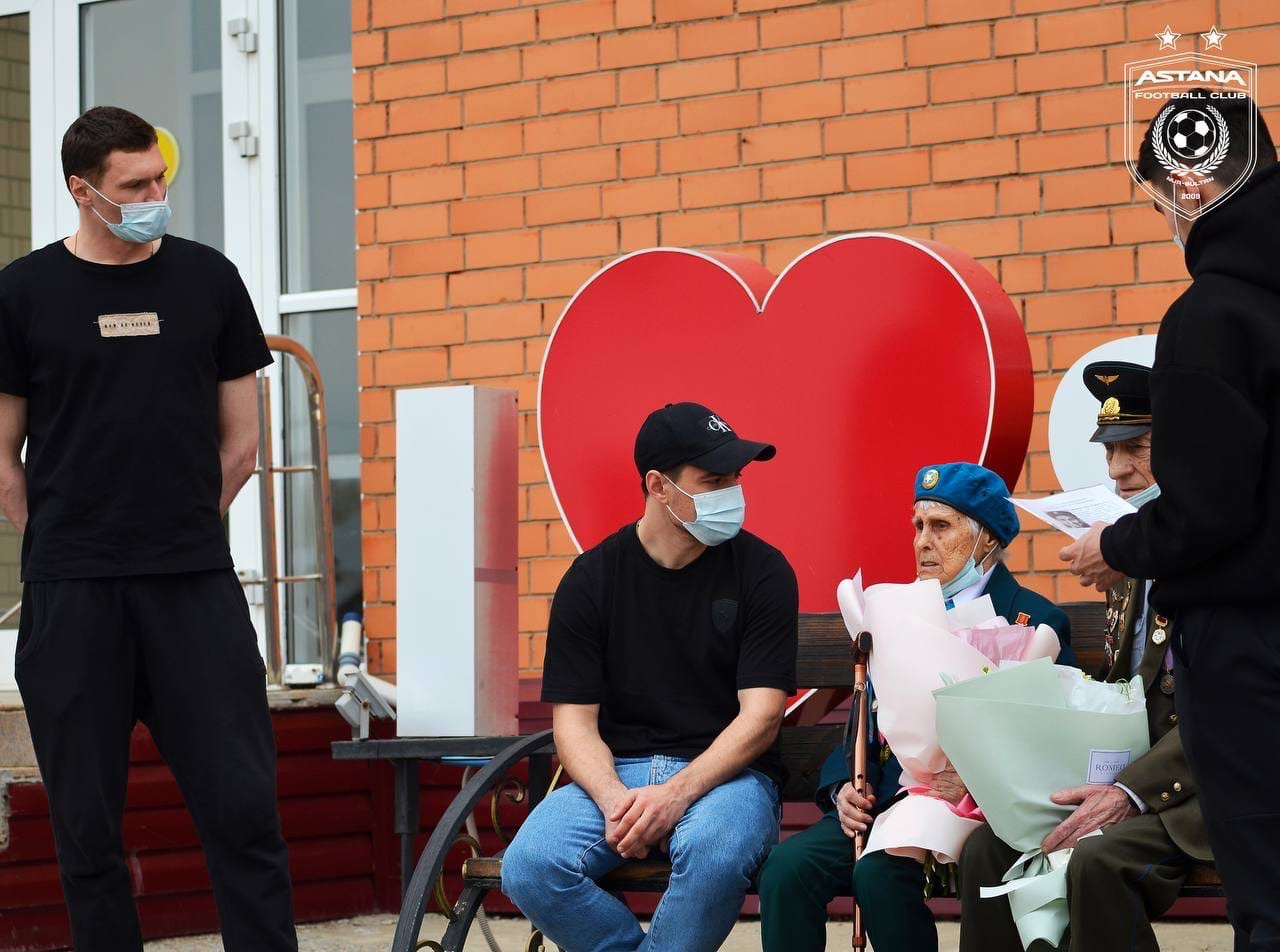 «В преддверии праздника Дня Победы в Великой Отечественной Войне, игроки основного состава «Астаны» Дмитрий Непогодов, Валерий Чуперка и Саги Совет посетили дом престарелых города Нур-Султан.