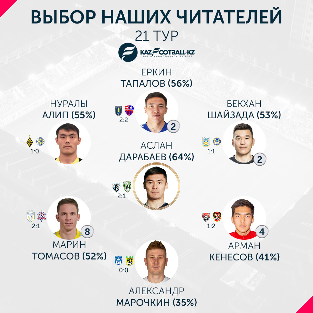 Наибольший процент голосов получил полузащитник «Каспия» Аслан Дарабаев – 64%. Он забил гол с 11-метровой отметки в ворота «Атырау» (2:1).