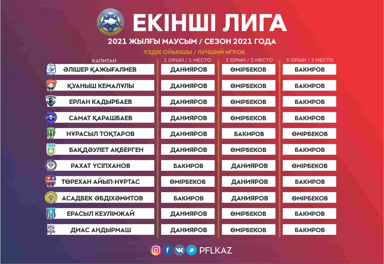 Второе место в голосовании занял полузащитник молодежной команды «Ордабасы» Шадман Бакиров. 20-летний футболист в сыгранном сезоне в рамках Кубка Казахстана дебютировал за основной состав шымкентского клуба, но эта игра пока остается единственной для него. Основную же часть сезона он провел во Второй лиге, отыграв там 17 матчей и отличившись забитыми мячами 10 раз.